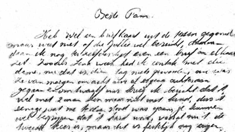 Deel van de brief van Ies aan Lena, geschreven in de trein naar Westerbork. “Beste Fam. Heb wel een briefkaart uit de trein gegooid maar weet niet of die jullie wel bereikt, vandaar dat ik te zelfder tijd nog een brief in elkaar zet. Zoals Lena weet had ik contact met die dame, nu dat is die dag niets geworden. Nu was ze vanmorgen om acht uur al ergens achteraangegaan en voor twaalf uur kreeg ik bericht dat ’t wel met 2 man kon maar niet met kind, dus het enige wat me te doen stond was gaan. Jullie kunnen wel begrijpen dat ‘t hard was, vooral omdat het de tweede keer is … “, Familiearchief Mieke de Ruiter.