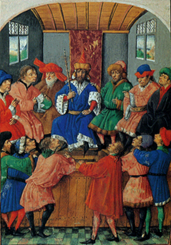 Zitting van een rechtbank. Miniatuur in de Historiebijbel van Evert Zoudenbalch, Utrecht, ca. 1460