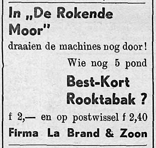 Boven u staat een bijzonder beeldje. Het is ‘De Rokende Moor’, een man met donkere huid, met een tulband op zijn hoofd en een pijp in de hand. Hier in de Korte Sint Janstraat was vanaf 1814 een tabakszaak gevestigd lange tijd geleid door de familie La Brand. Al snel werd de zaak uitgebreid met een tabakskerverij en -snijderij voor het bewerken van tabaksbladen en een droogoven geïnstalleerd. Op de bovenverdieping en in het pand aan de rechterkant werd pijptabak geproduceerd, vulling voor sigaren gemaakt en dekbladen gesneden. ...