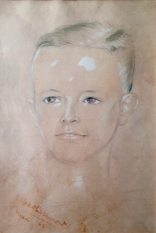 Portret van François, getekend in mei 1943 in het interneringskamp Kareës in Bandoeng op Java. Het is mogelijk getekend door een Jac. Dumont. Moeder Corry en haar twee kinderen, François en Nelly, zijn dan nog samen. In april 1944 wordt Francois opgesloten in een jongenskamp en Corry met dochter Nelly in het kamp Tjideng in Batavia (nu Jakarta). In augustus 1945 wordt Java bevrijd van de Japanse bezetting. Afbeelding familiearchief Kloppert.