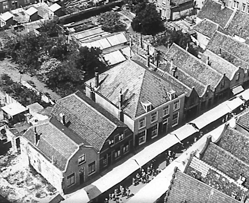Het woonhuis van de familie Hoogstra in het midden, Varremarkt nr. 5 in Zierikzee, gefotografeerd vanaf de Dikke Toren in 1950. Zeeuws Archief nr. DIA-0592.