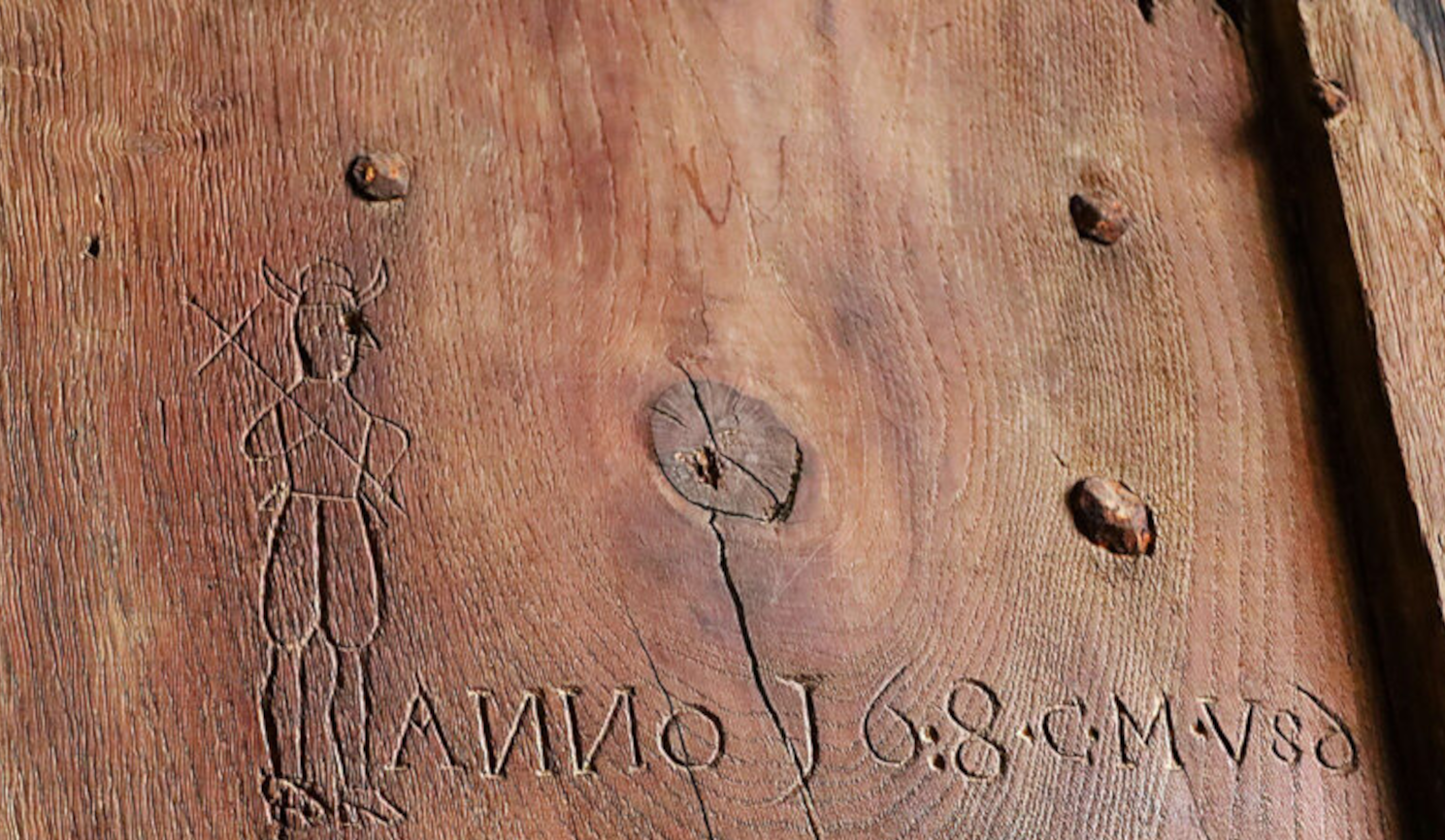 Inscriptie van een gevangene in de eikenhouten wanden van de gevangenis.