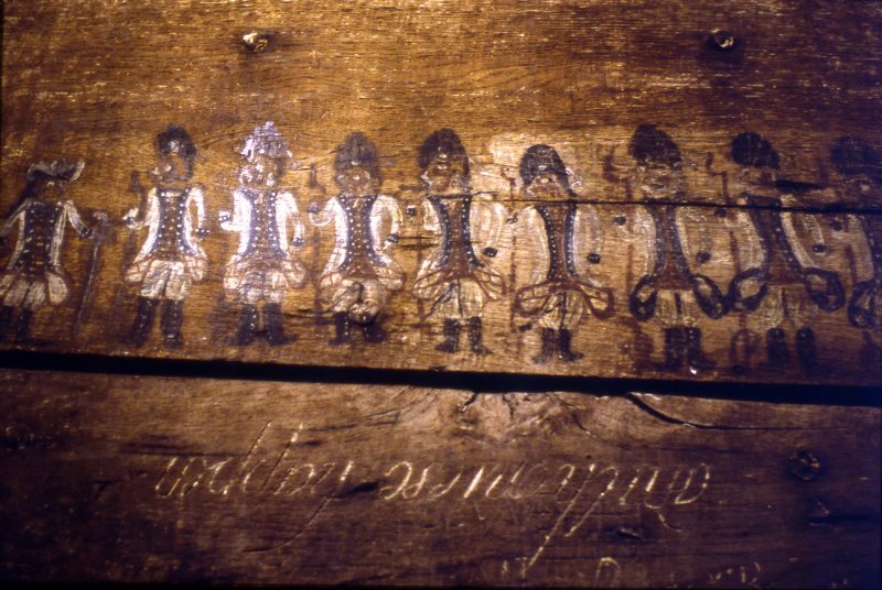 Oosterrijkse soldaatjes geschilders op de eikenhouten wand van de gevangenis.