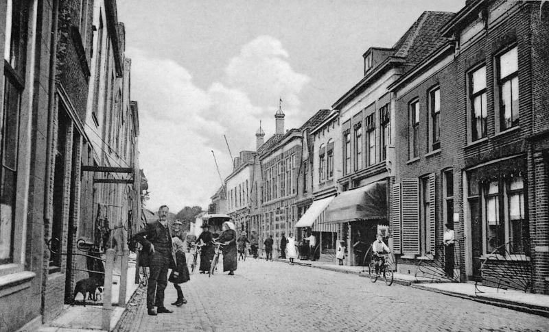 De Lange Nobelstraat in Zierikzee 1925. In het eerste huis aan de rechterkant is de manufacturenzaak van Mien Labzowski gevestigd. Daarnaast met de luifels boekhandel P.J. Ochtman en Bakkerij Brouwer. Foto: Zeeuws archief vervaardigd door fotograaf P. J. Ochtman, nr. ZS-0729.