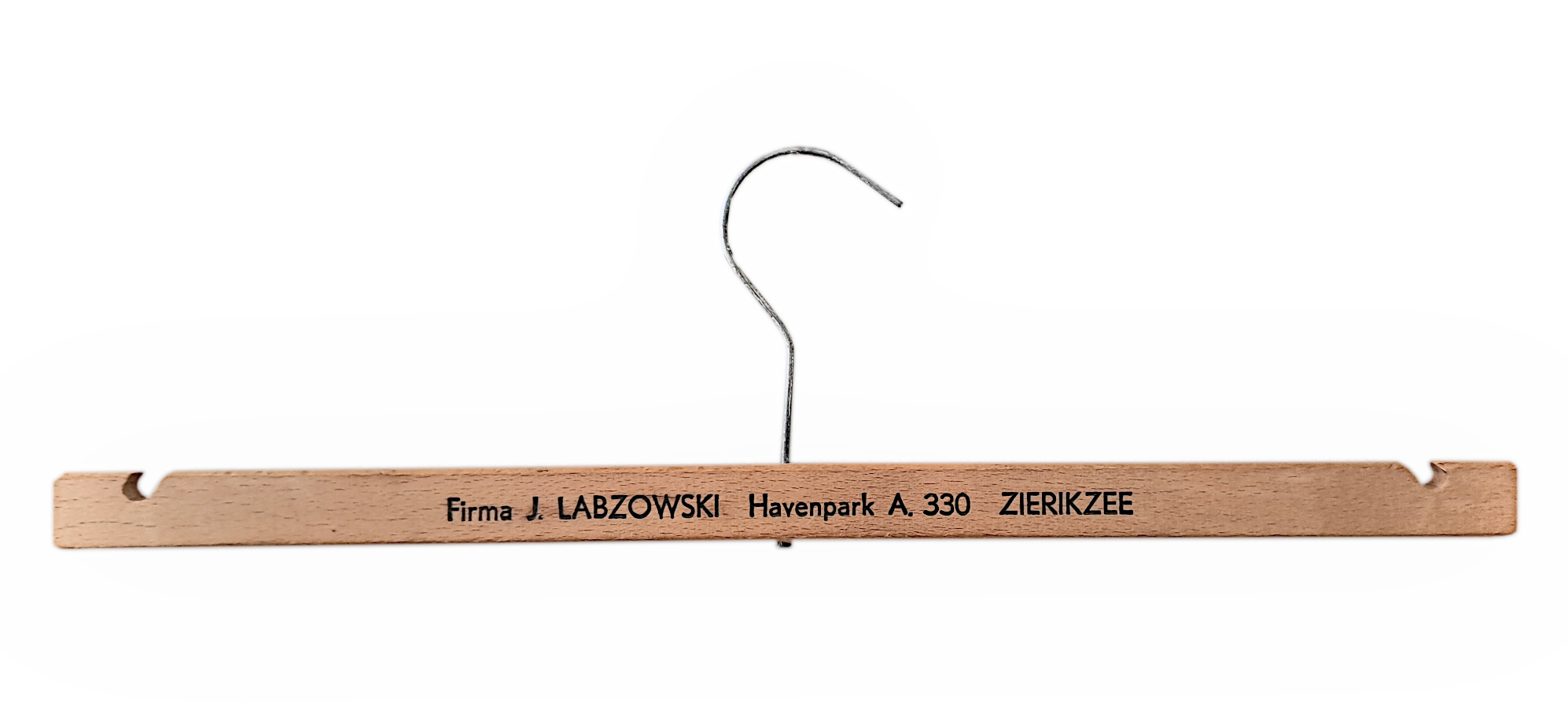 Kleerhanger van de Firma J. Labzowski, de vader van Mien, is één van de weinige bewaard gebleven attributen uit de manufacturenzaak van de Labzowski ’s. Schenking Charlotte Koster aan de nabestaanden.