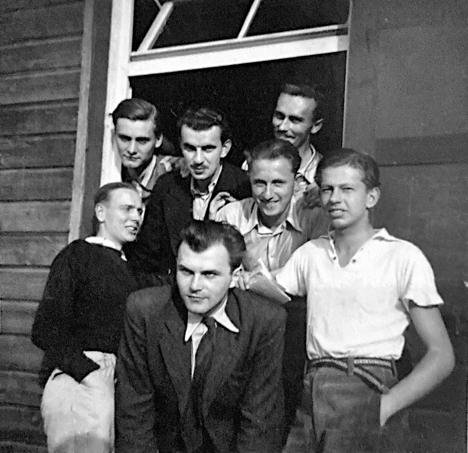 Sjoerd in 1943, rechts in het witte hemd, met een groep dwangarbeiders in Henningsdorf, vlak bij Berlijn, waar hij werkt in de Borsig Lokomotief Werke. Foto familiearchief Kloppert.