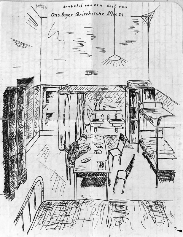 Tekening van Sjoerd van het Lager Griechische Allee in Berlijn, vlak bij de Spree in februari 1944. Hij is tewerkgesteld in een zoekllichten fabriek in de wijk Schöneweide. Foto familiearchief Kloppert.